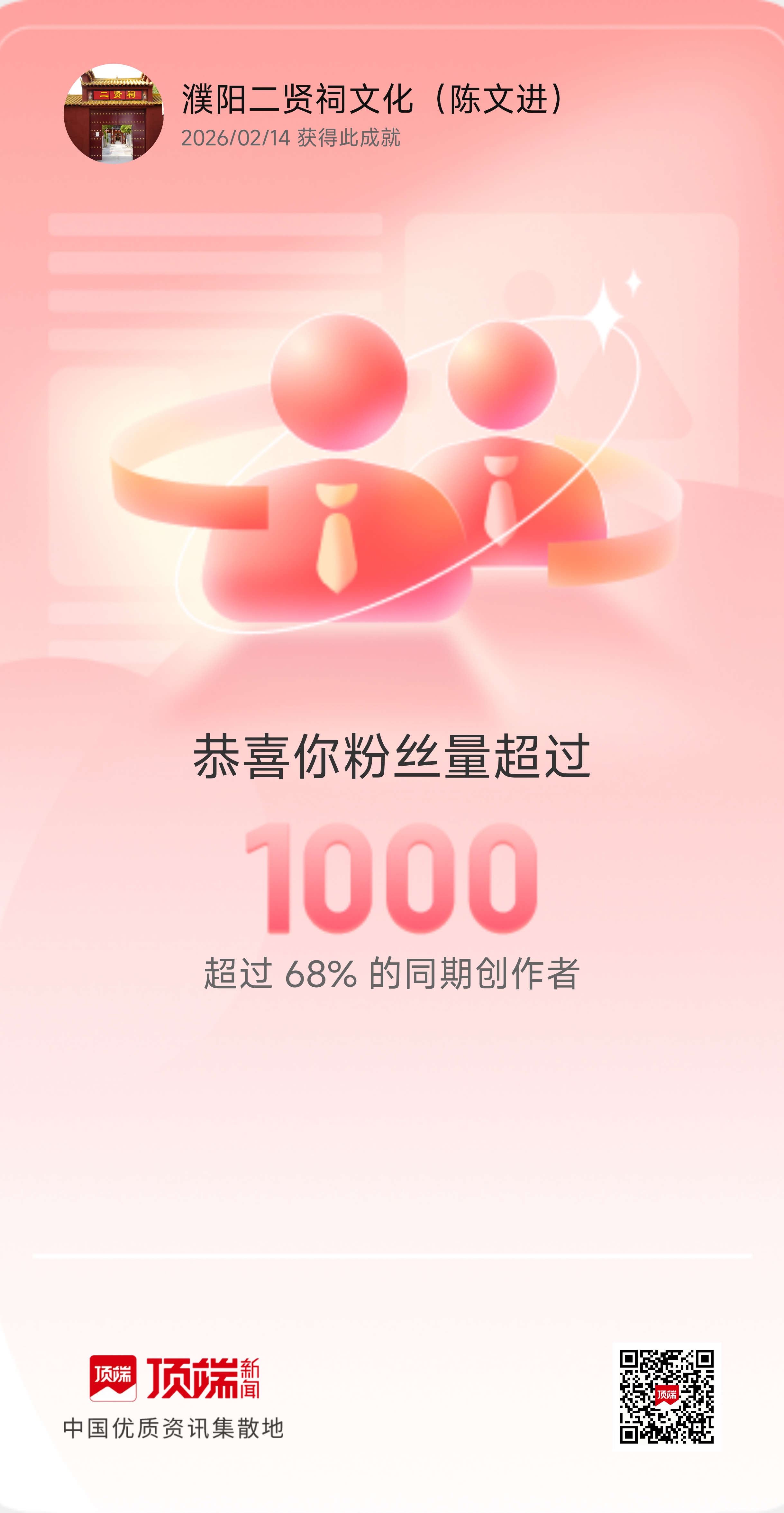 承蒙各位宗亲、同好、乡邻一路相伴,今日本号粉丝正式破千!感恩每一次关注、点赞与转发,让小众而珍贵的先贤文化、宗族历史,遇见更多志同道合的传承者。