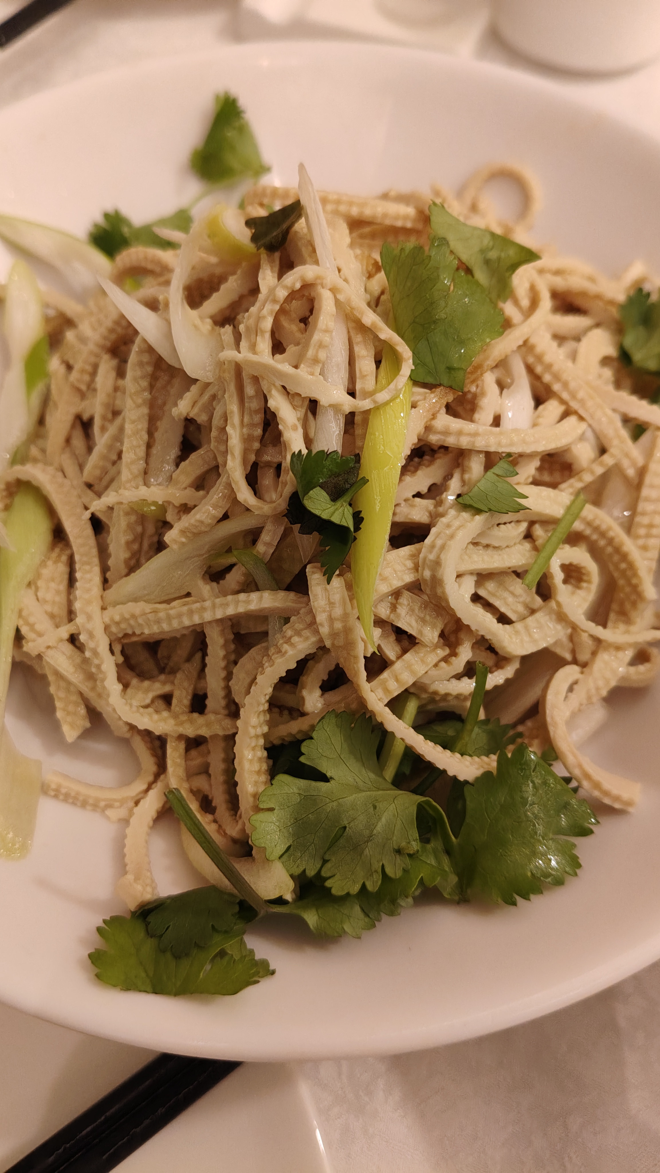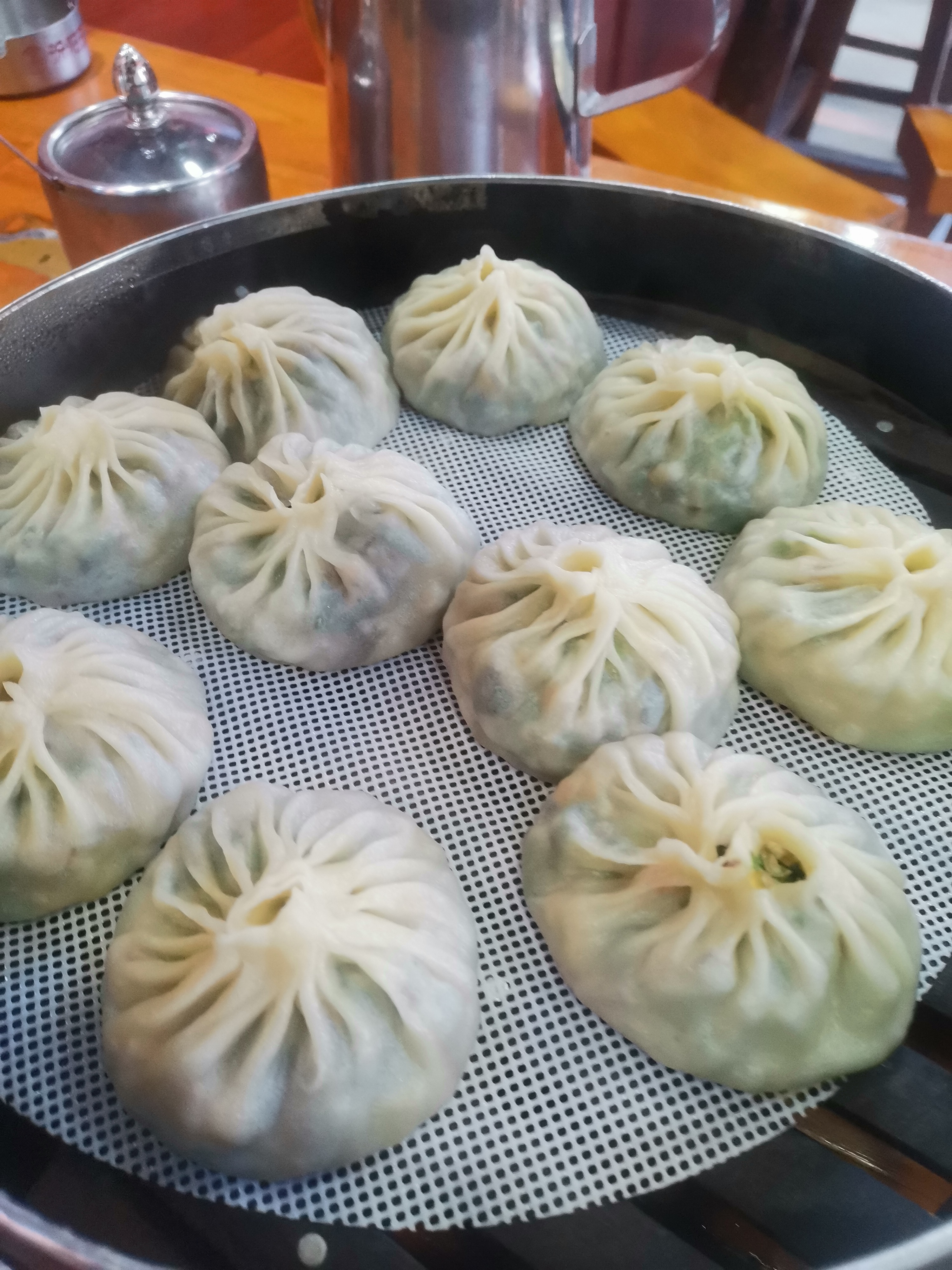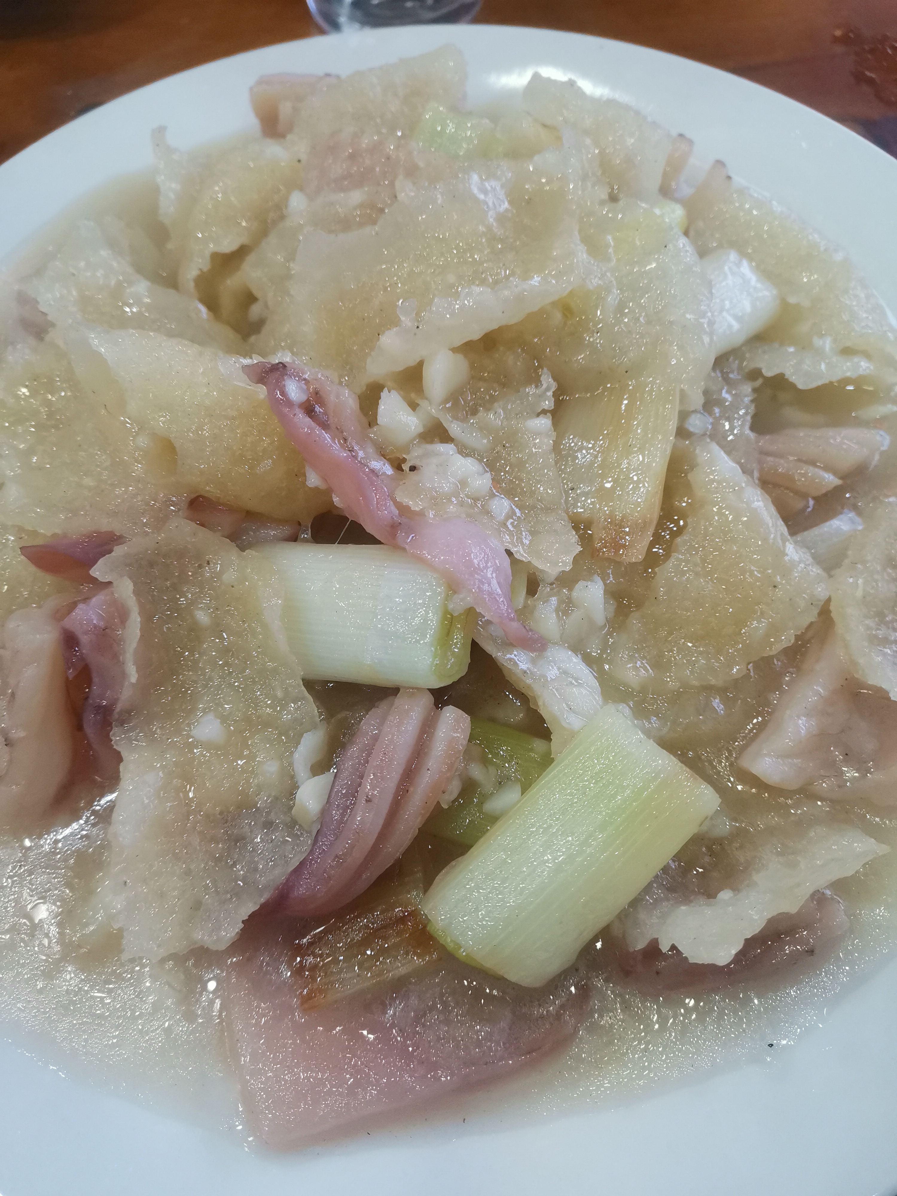 一盘凉菜,一大盘皮肚烧鱿鱼,两笼包子(一荤一素)。团购价六十元,性价比很高,两个大男人没有吃完打包了。