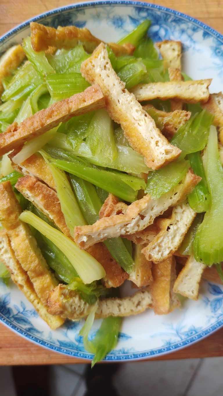 我把豆腐过油炸了准备熬菜用,但是今天把炸过的豆腐切成条配着芹菜炒也挺好吃的。😊