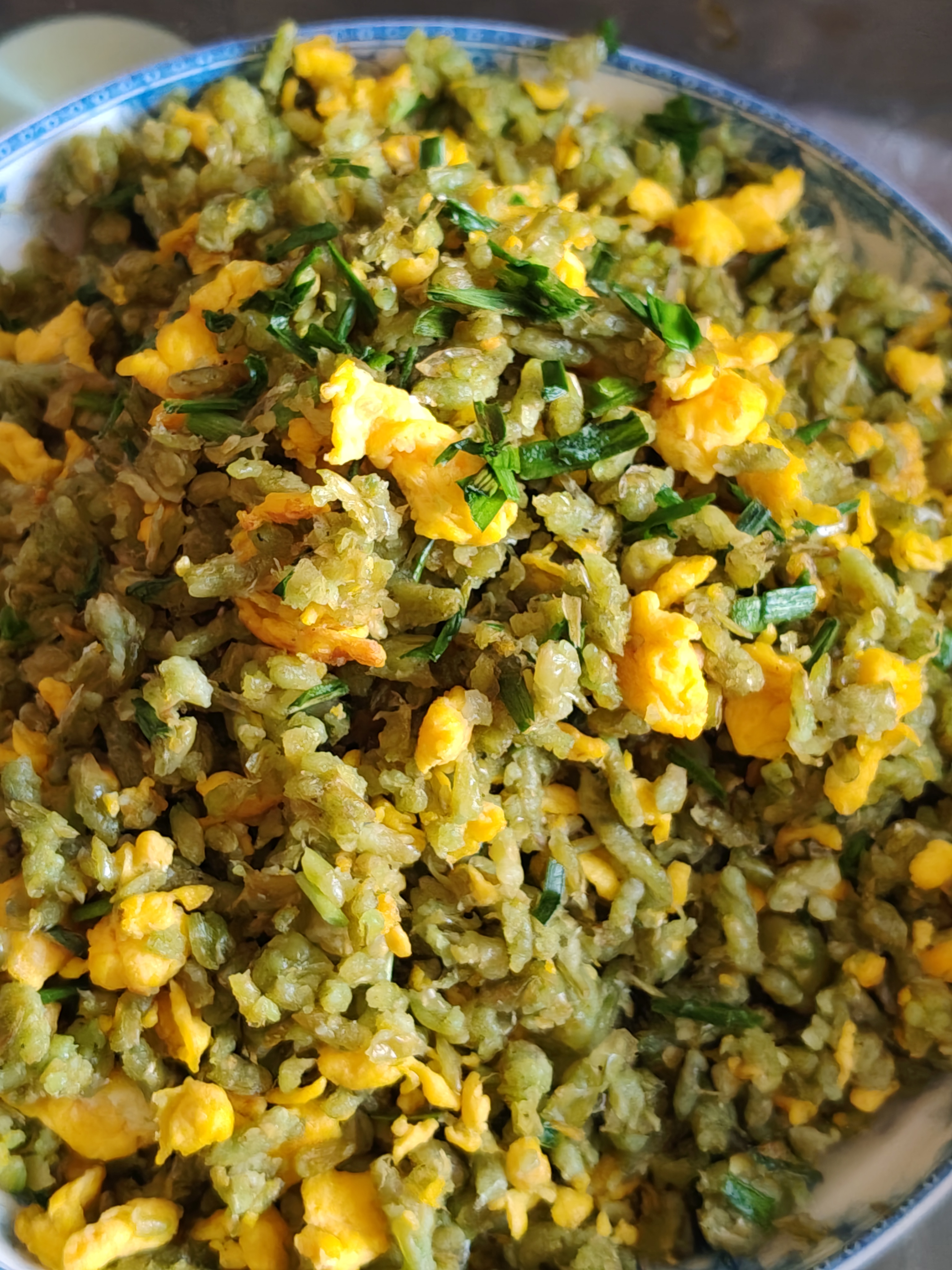 冰箱里拿出了冻了半年的碾转化冻,和鸡蛋炒了,出锅前撒了些蒜苗碎。