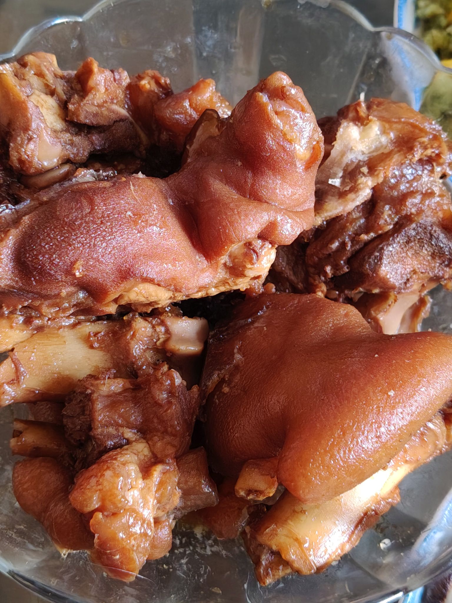 猪蹄冷水下锅加高度白酒焯水后,放入砂锅里,下葱段 姜片 八角 花椒 白芷 山楂 干辣椒 冰糖 酱油,大火煮开,中火十五分钟,小火三十分钟后关火在砂锅里焖十分钟即可。