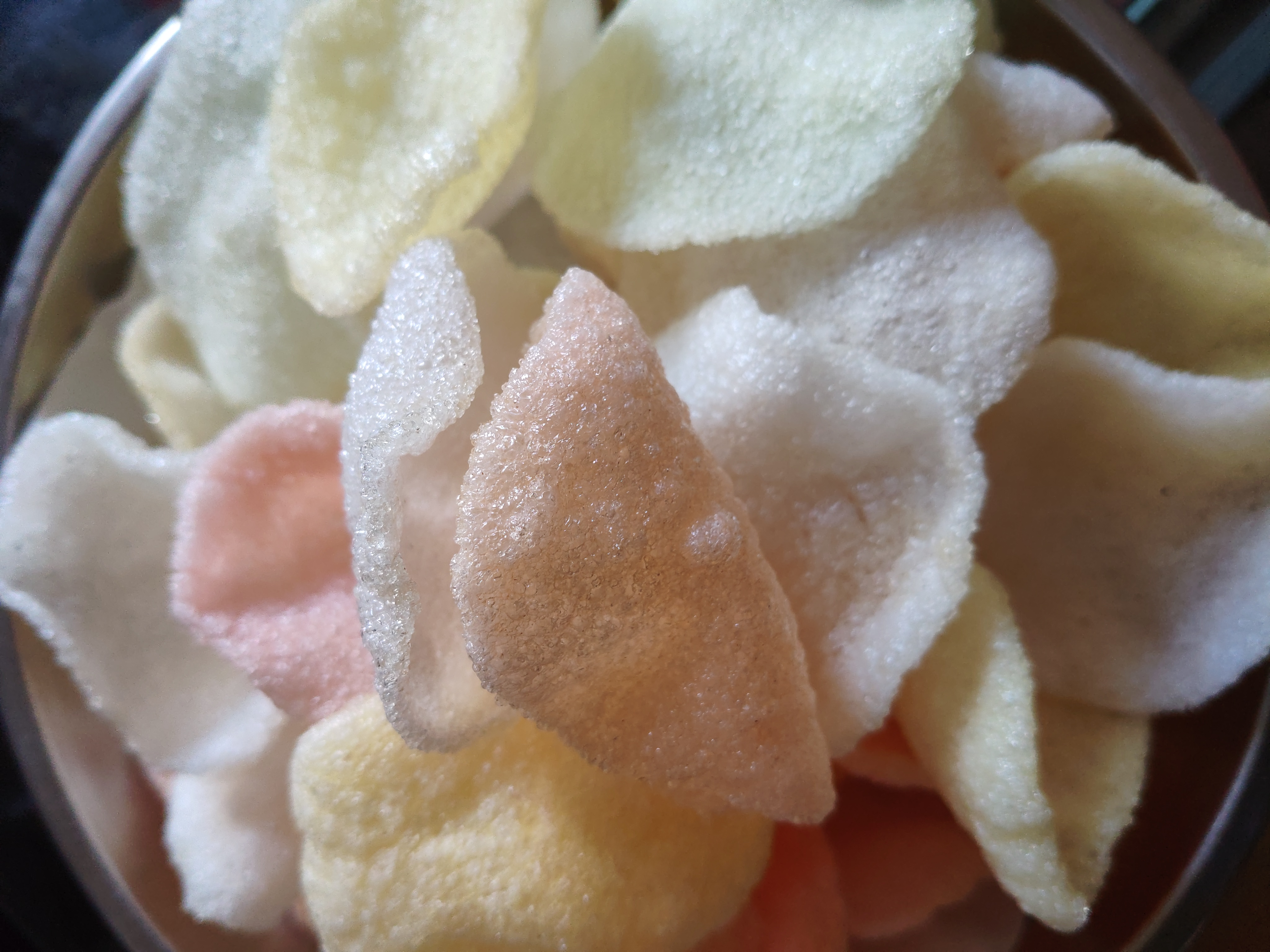 以前炸虾片用的是温油炸,今天在网上看的是用七成热的油炸,迅速膨胀,虾片上的油还少。