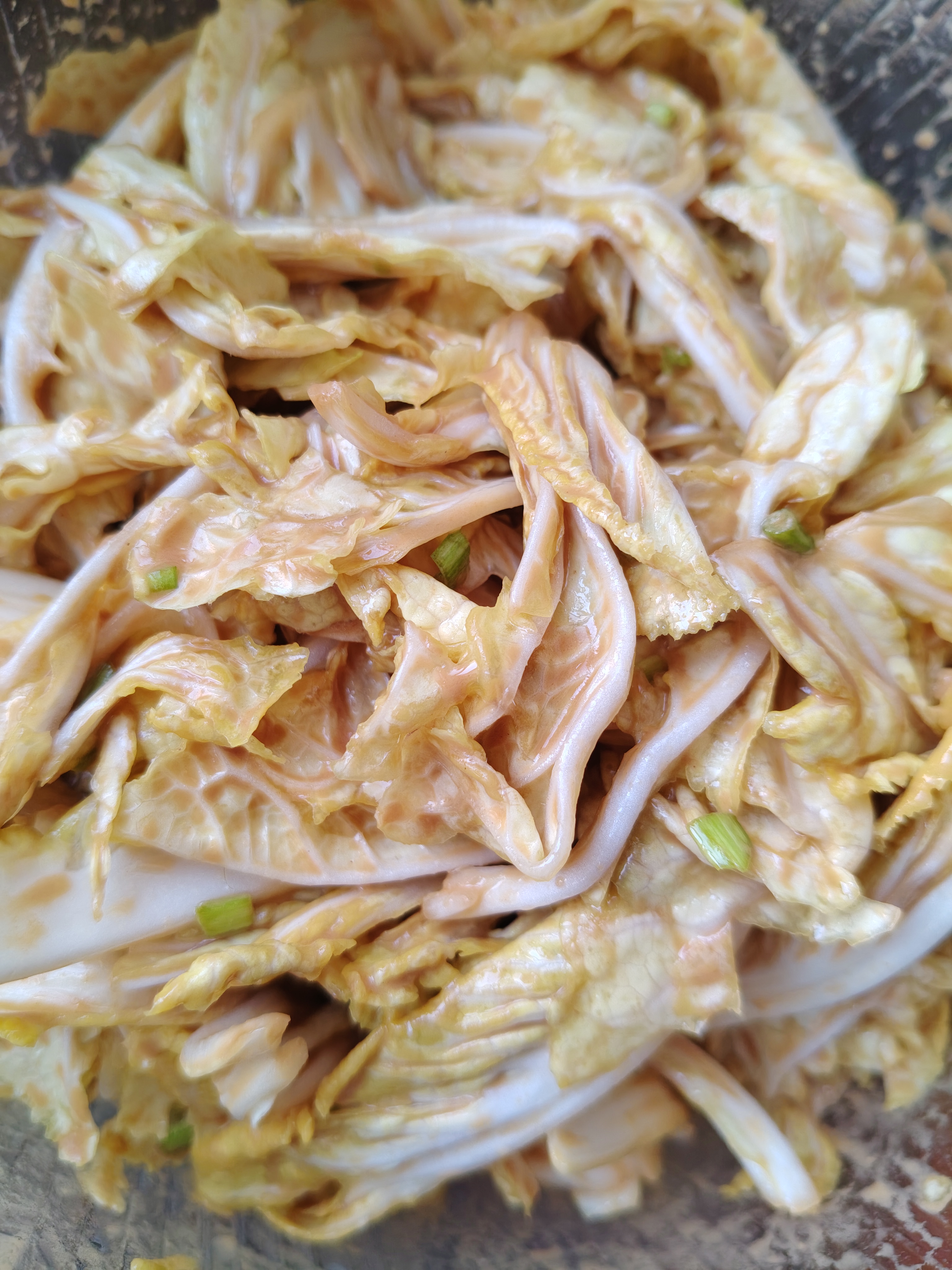 今天中午做了道 乾隆白菜。白菜心只要叶子不要帮,而且用手把叶子撕下来,不要用刀。芝麻酱用香油,生抽,凉白开泄开浇到白菜叶子上拌匀即可。