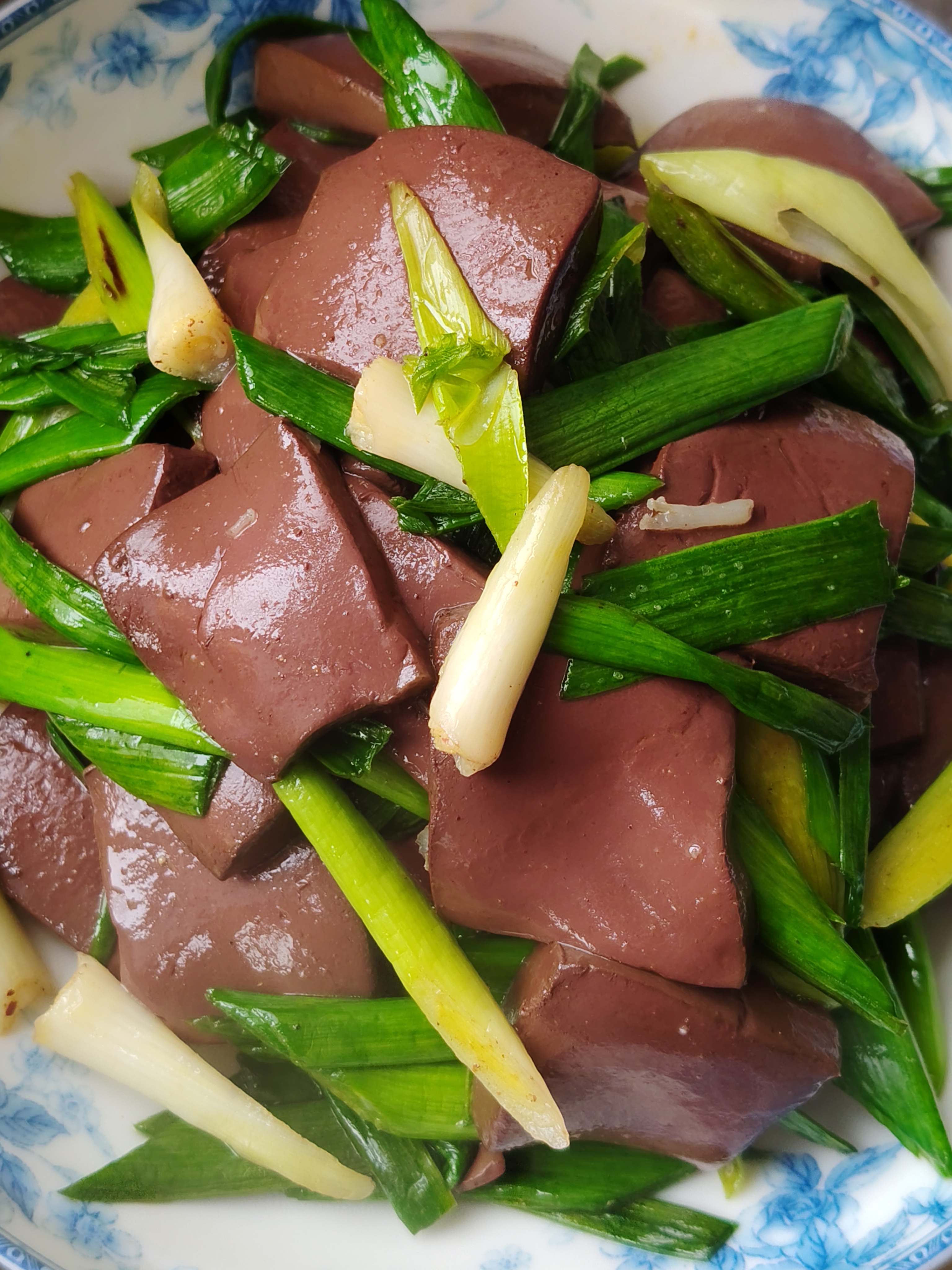 华英鸭血一盒,蒜苗一把。 鸭血切块,焯水定型 去腥。蒜苗切斜刀,茎 叶分开。 热锅凉油,放入蒜苗茎炒出蒜香,倒进鸭血,烹入黄酒,下蒜苗叶,加盐 白胡椒粉 味精,翻炒片刻即成。