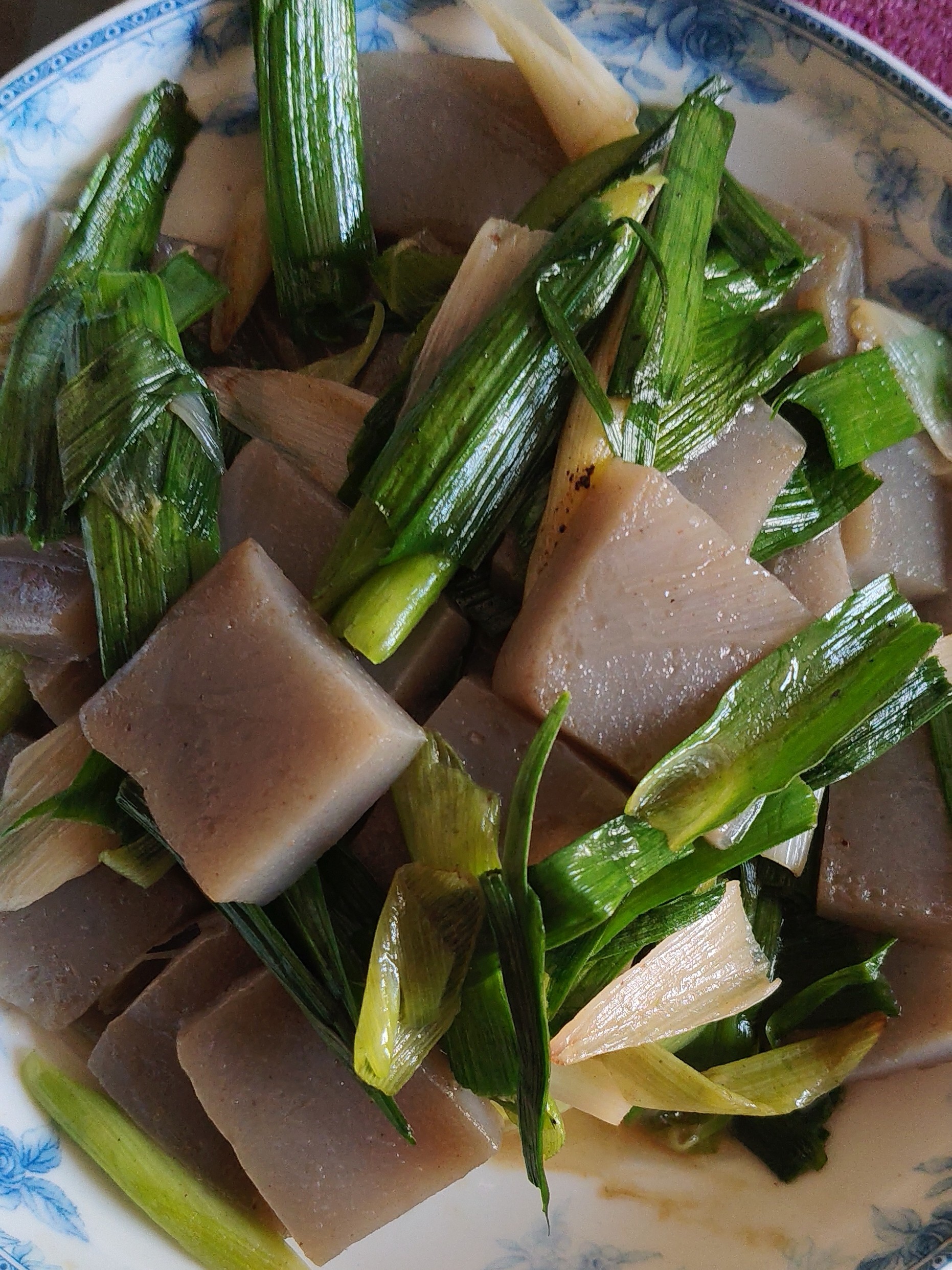 魔芋是我吃火锅类必吃的食材,炒着吃还是第一次,它本身没有味道,借其它食材之味,要是配辣椒可能要比蒜苗好吃。