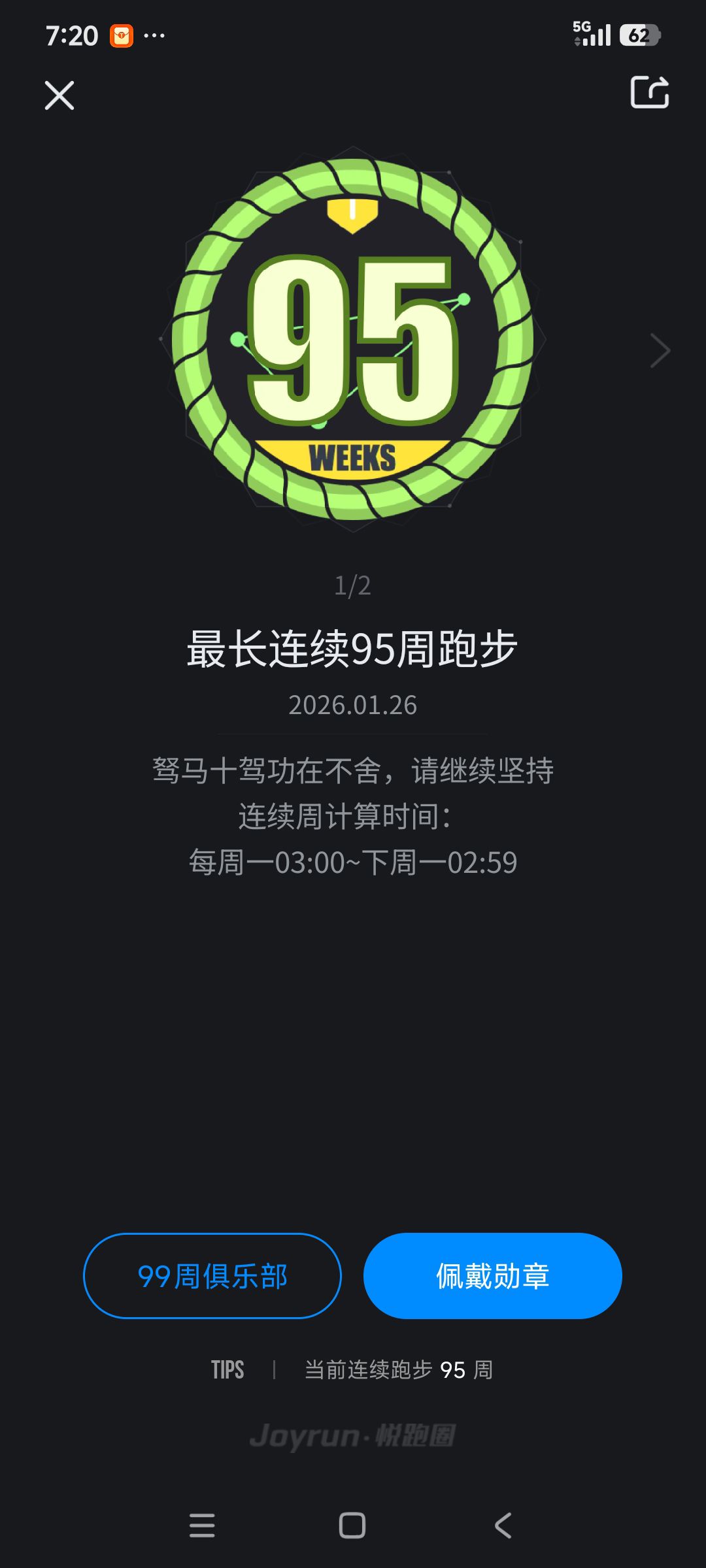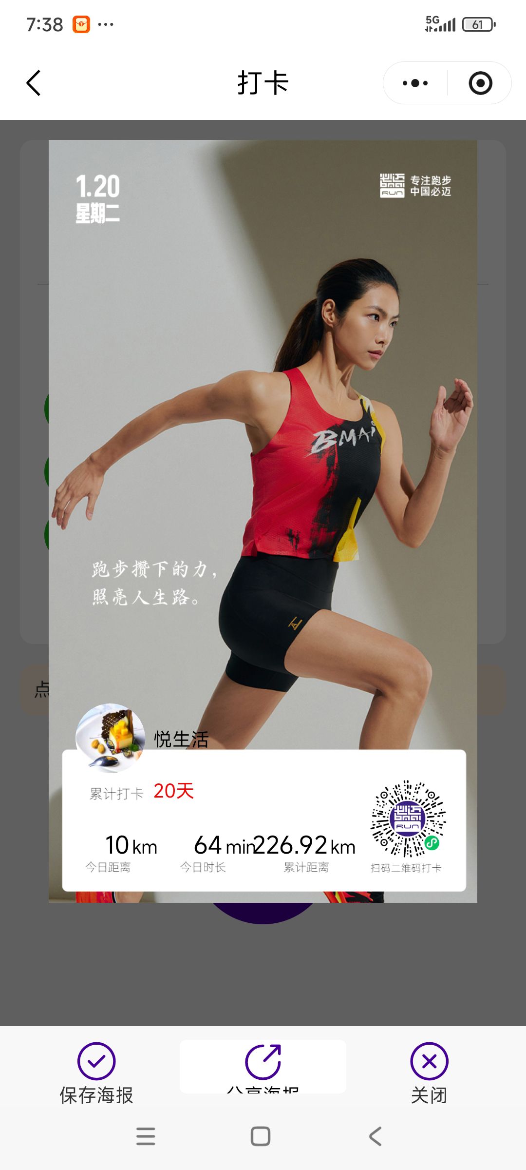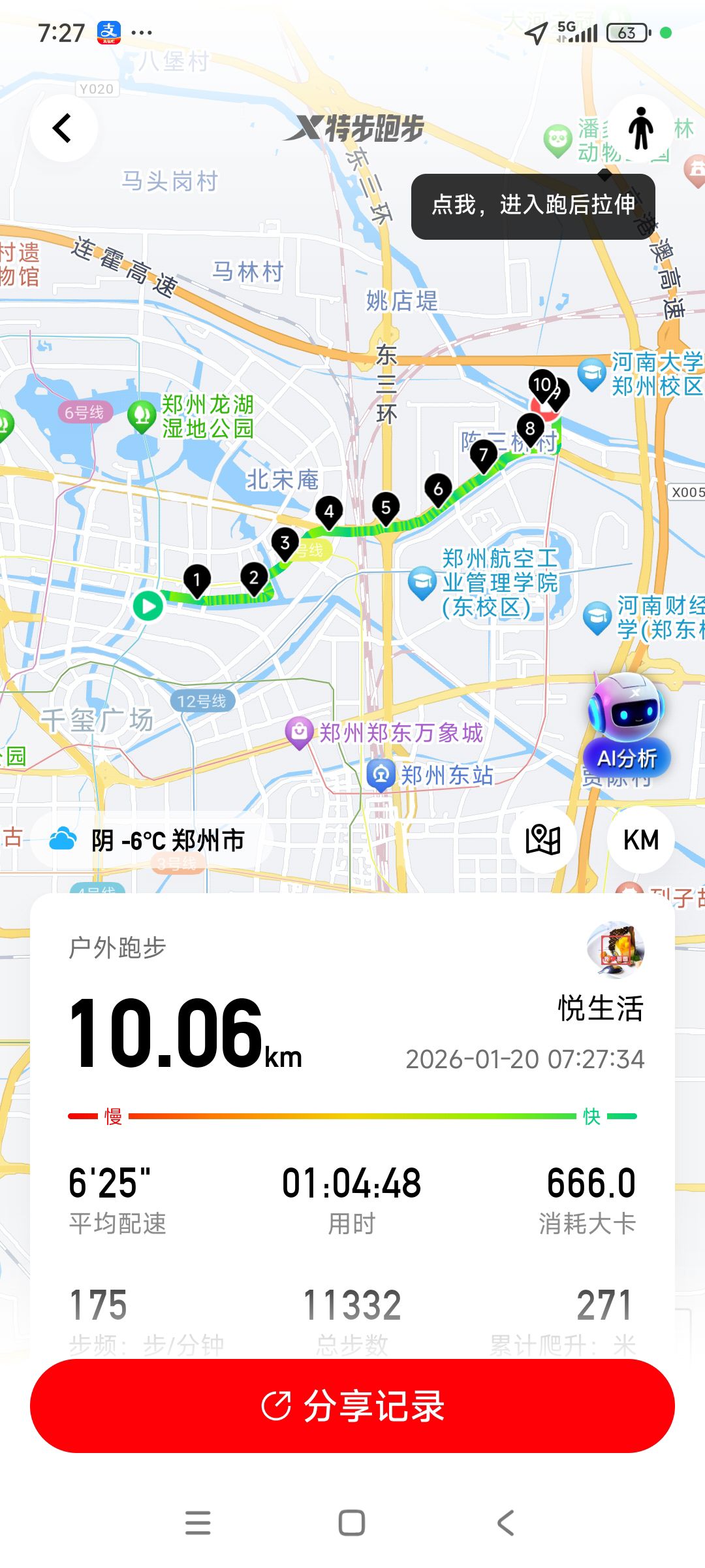 跑步打卡。 今天是2026年1月20日,农历十二月初二,星期二,早上跑步10.06公里。心态平和,与人友善,做个幸福的人,爱生活,悦生活。