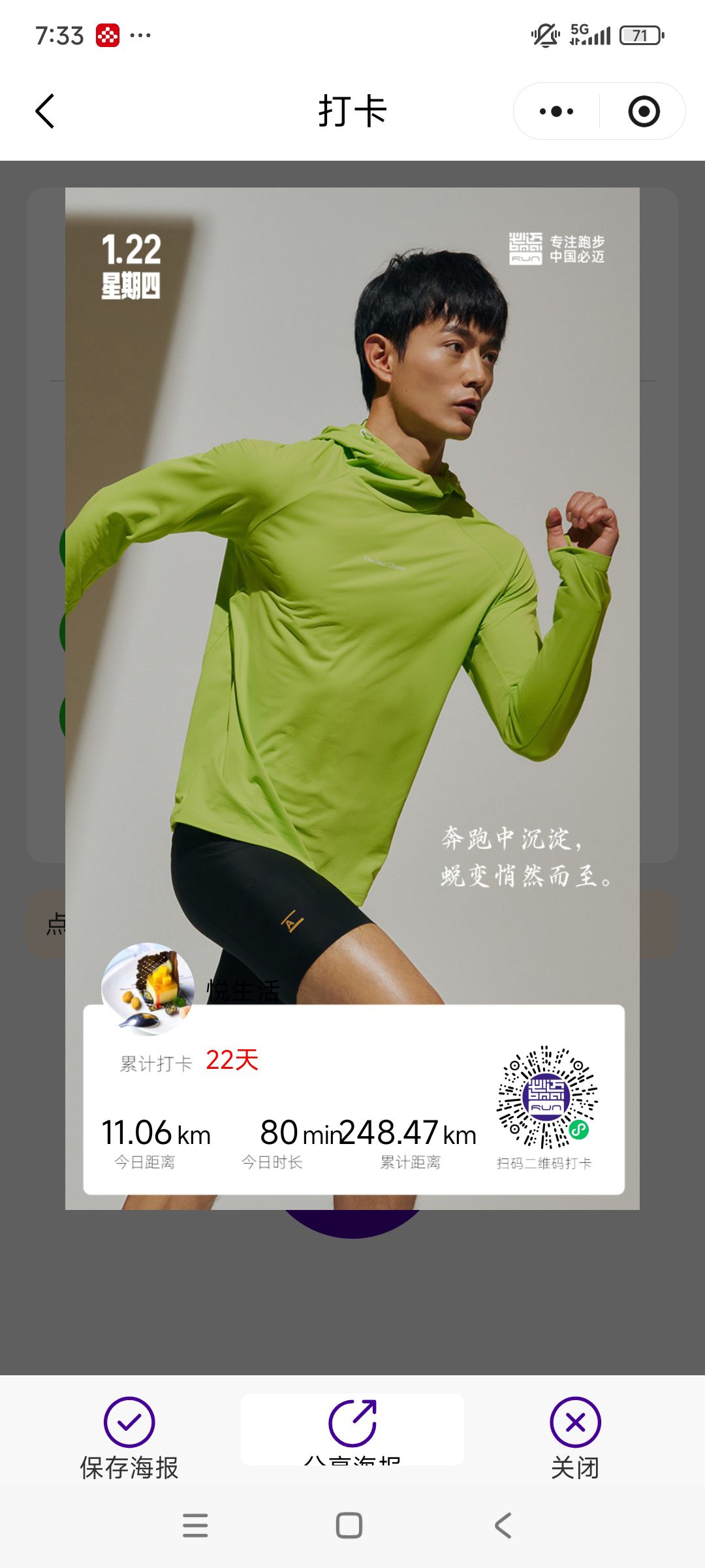 跑步打卡。 今天是2026年1月22日,农历十二月初四,星期四,早上跑步11.06公里。心态平和,与人友善,做个幸福的人,爱生活,悦生活。