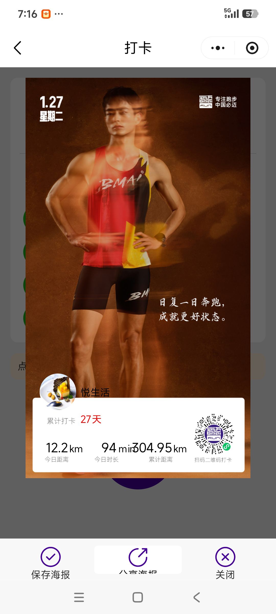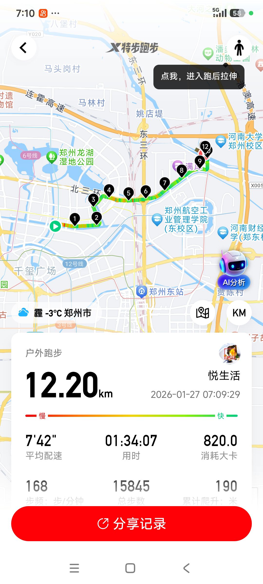 跑步打卡。 今天是2026年1月27日,农历十二月初九,星期二,早上跑步12.20公里。心态平和,与人友善,做个幸福的人,爱生活,悦生活。
