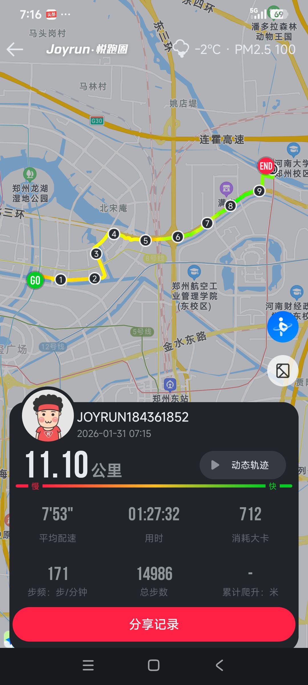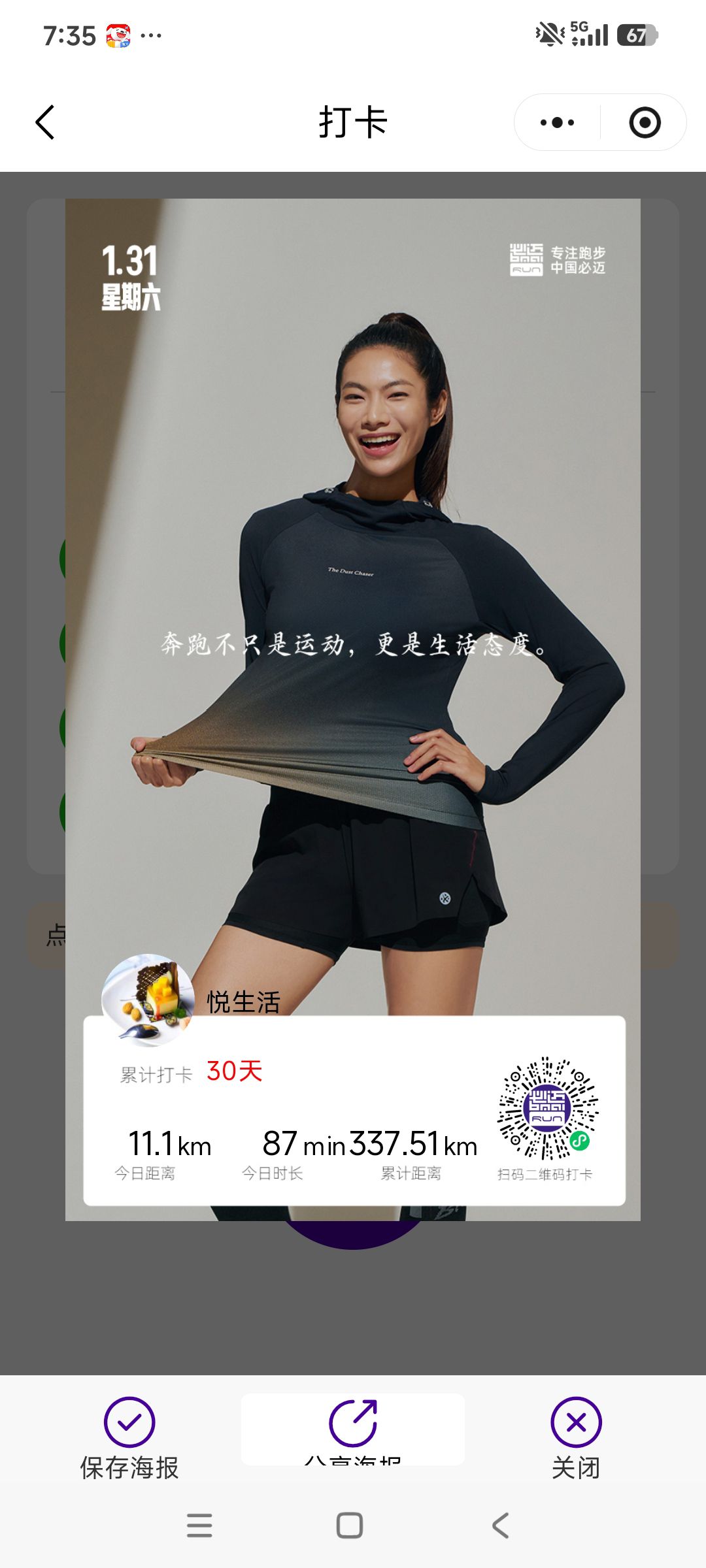 跑步打卡。 今天是2026年1月31日,农历十二月十三,星期六,早上跑步11.10公里。心态平和,与人友善,做个幸福的人,爱生活,悦生活。