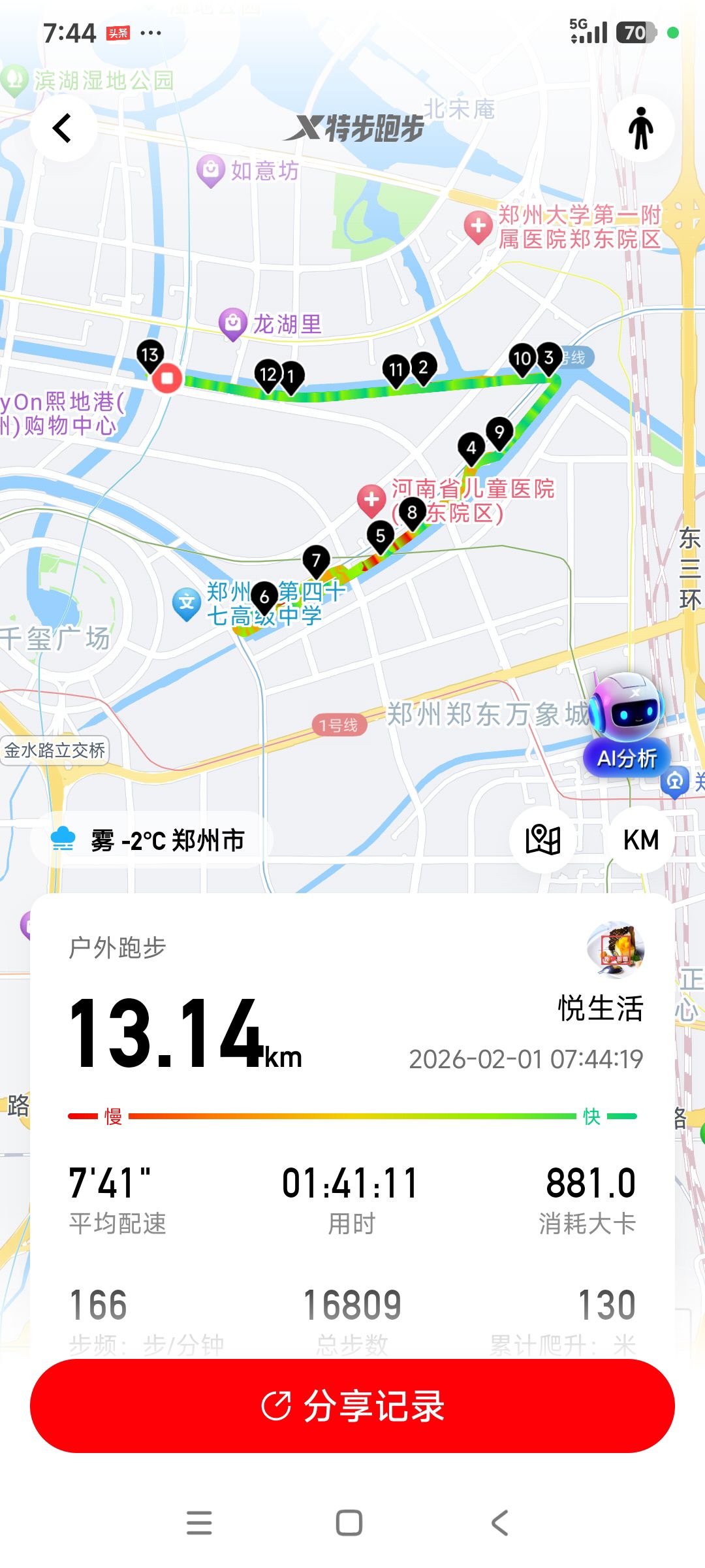 二月你好! 跑步打卡。 今天是2026年2月1日,农历十二月十四,星期日,早上跑步13.14公里。心态平和,与人友善,做个幸福的人,爱生活,悦生活。