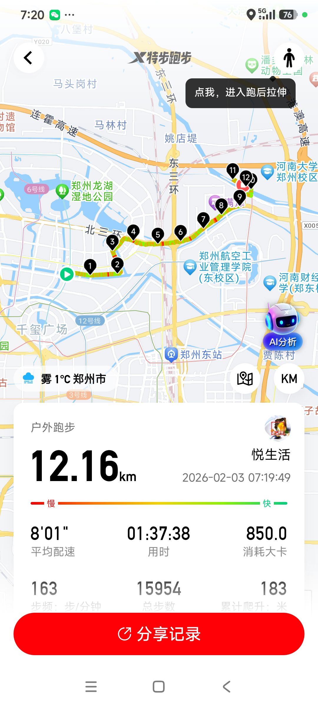 跑步打卡。 今天是2026年2月3日,农历十二月十六,星期二,早上跑步12.16公里。心态平和,与人友善,做个幸福的人,爱生活,悦生活。