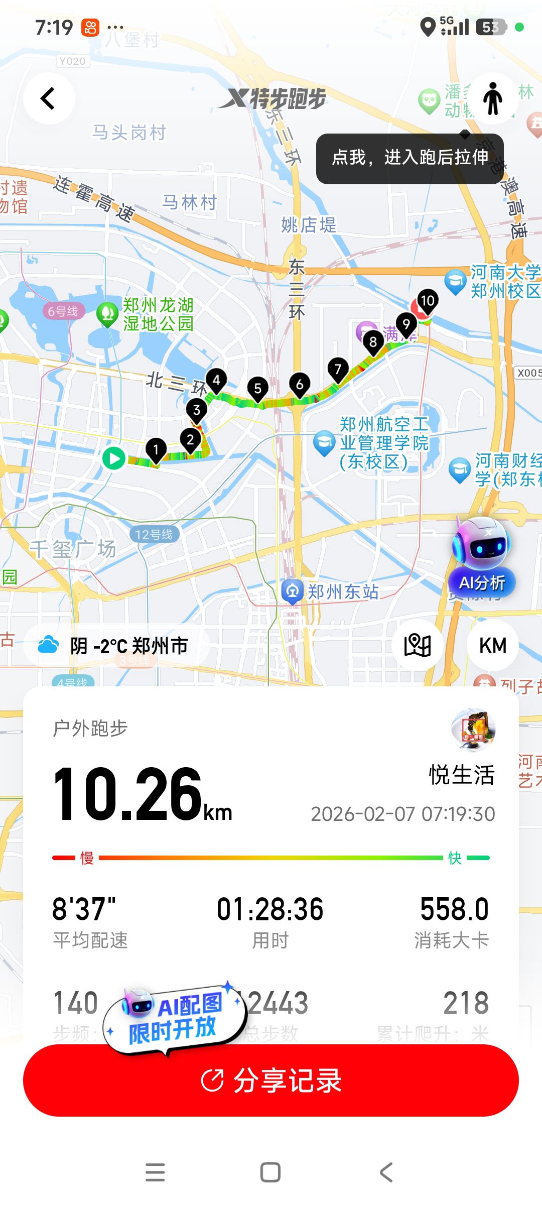 跑步打卡。 今天是2026年2月7日,农历十二月二十,星期六,早上跑步10.26公里。心态平和,与人友善,做个幸福的人,爱生活,悦生活。