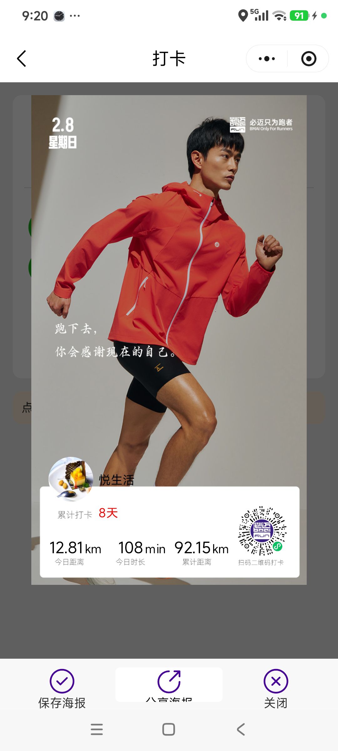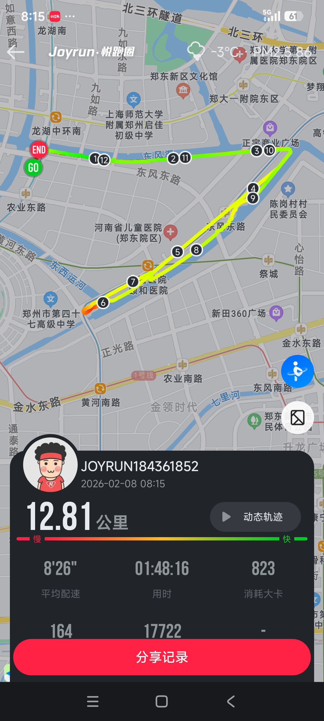 跑步打卡。 今天是2026年2月8日,农历十二月二十一,星期日,早上跑步12.81公里。心态平和,与人友善,做个幸福的人,爱生活,悦生活。