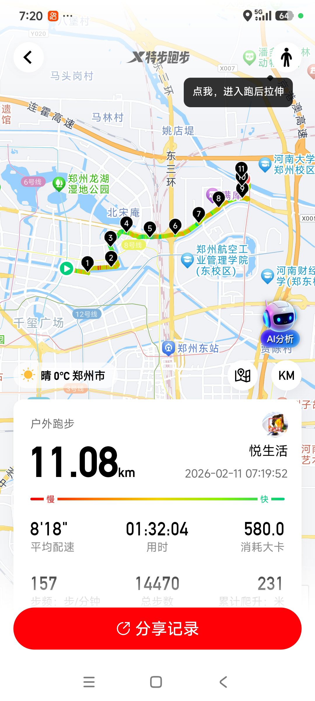 跑步打卡。 今天是2026年2月11日,农历十二月二十四,星期三,早上跑步11.08公里。心态平和,与人友善,做个幸福的人,爱生活,悦生活。