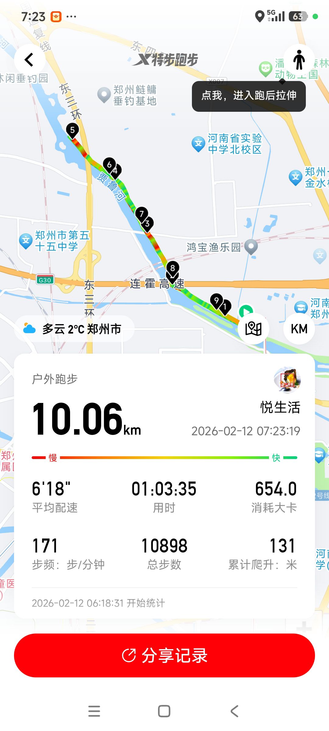 跑步打卡。 今天是2026年2月10日,农历十二月二十三,星期二,早上跑步10.96公里。心态平和,与人友善,做个幸福的人,爱生活,悦生活。