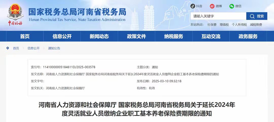 河南:关于延长2024年度灵活就业人员缴纳企业职工基本养老保险费期限的通知