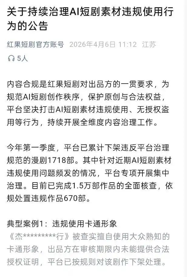 4月6日,红果短剧发布《关于持续治理AI短剧素材违规使用行为的公告》。