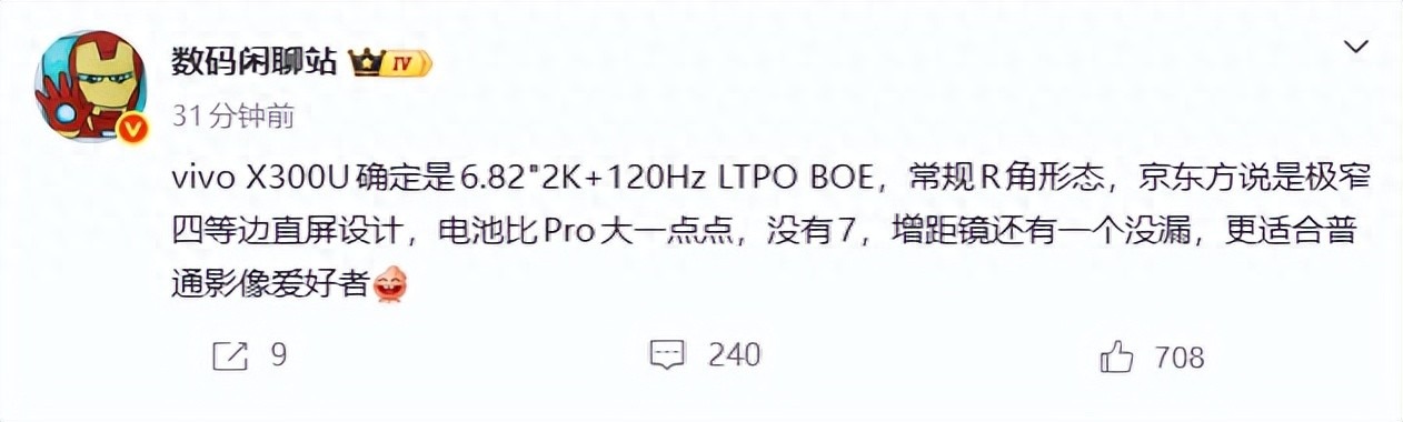在屏幕方面,除了京东方官宣的将为该机供屏之外,数码博主“数码闲聊站”也透露了vivo X300 Ultra屏幕的详细参数,该机将采用6.78英寸OLED直屏,支持2K分辨率和120Hz自适应刷新率,屏幕采用极窄四等边设计和常规R角形态。该博主还透露,vivo X300 Ultra电池容量会比此前发布的vivo X300 Pro更大,但未超过7000毫安时,该机还有一款更适合普通影像爱好者的增距镜,但官方尚未作展示。