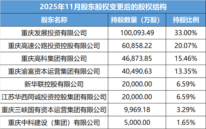 划转完成后,重庆渝富资本运营集团有限公司持有公司404,906,308股股份,持股比例为13.35%;重庆发展投资有限公司持有公司1,000,934,858股股份,持股比例为33%。