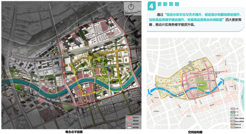 如果说“小陆家嘴(陆家嘴核心区)”是黄浦江畔的摩登代表,那么苏州河畔的苏河湾商务单元(苏河湾核心区),承载着上海的“历史记忆与新生活力”。这片1.2平方公里的区域,拥有2公里蜿蜒的滨河岸线。从《上海市静安、黄浦区苏河湾商务单元更新提升规划实施方案》(下称《方案》)来看,苏河湾核心区将充分发挥苏州河滨水特色,通过“一河、一心、一环、两片”的更新,加快总部经济集聚,推进金融服务、专业服务、科技创新三大重点产业发展;促进水岸文化与艺术提升、加强滨水腹地联动、完善生活配套服务体系,打造创意研发、滨水居住、时尚商业混合的世界级滨水活力街区。