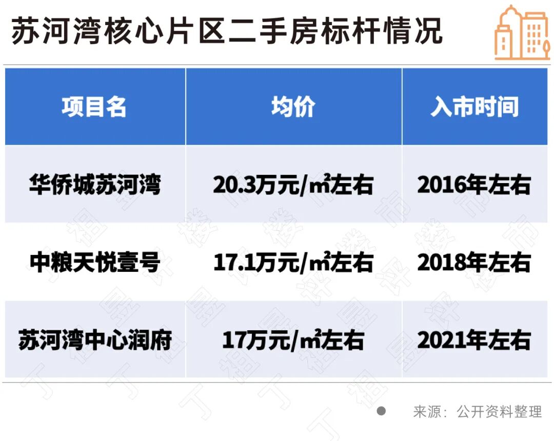 当前,苏河湾核心片区二手豪宅标杆价格在17-20.3万元/平方米左右,其中最贵的项目为2016年入市的华侨城苏河湾,均价20.3万元/平方米左右。