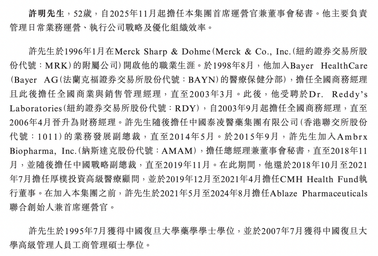 许明于1996年1月在Merck Sharp & Dohme(Merck & Co., Inc.的附属公司)开启他的职业生涯。于1998年8月,他加入Bayer HealthCare(Bayer AG的医疗保健分部),担任全国商务经理且此后担任全国商业与销售管理经理,直至2003年3月。此后,他受聘于Dr. Reddy’sLaboratories,自2003年9月起担任全国商务经理,直至2006年4月晋升为财务经理。许明随后担任中国泰凌医药集团有限公司的业务发展副总裁,直至2014年5月。于2015年9月,许明加入AmbrxBiopharma, Inc.,担任总经理兼董事会秘书,直至2018年11月,并随后担任中国战略副总裁,直至2019年11月。在此期间,他还于2018年10月至2021年7月担任厚朴投资高级医疗顾问,并于2019年12月至2021年4月担任CMH Health Fund执行董事。在加入集团之前,许明于2021年5月至2024年8月担任Ablaze Pharmaceuticals联合创始人兼首席运营官。