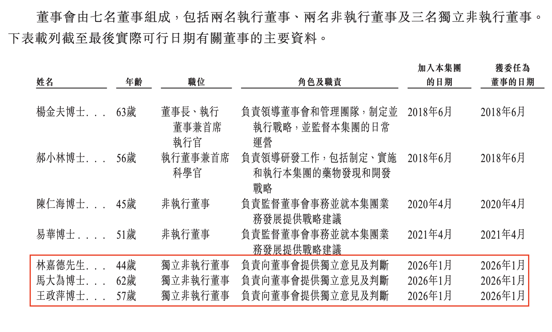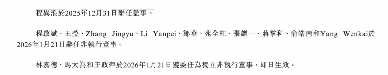 2026年1月21日,程启斌、王莹、Zhang Jingyu、Li Yanpei、邹华、苑全红、张勰一、蒋掌科、俞皓南和Yang Wenkai辞任非执行董事,许明辞任执行董事。林嘉德、马大为和王政萍获委任为独立非执行董事。