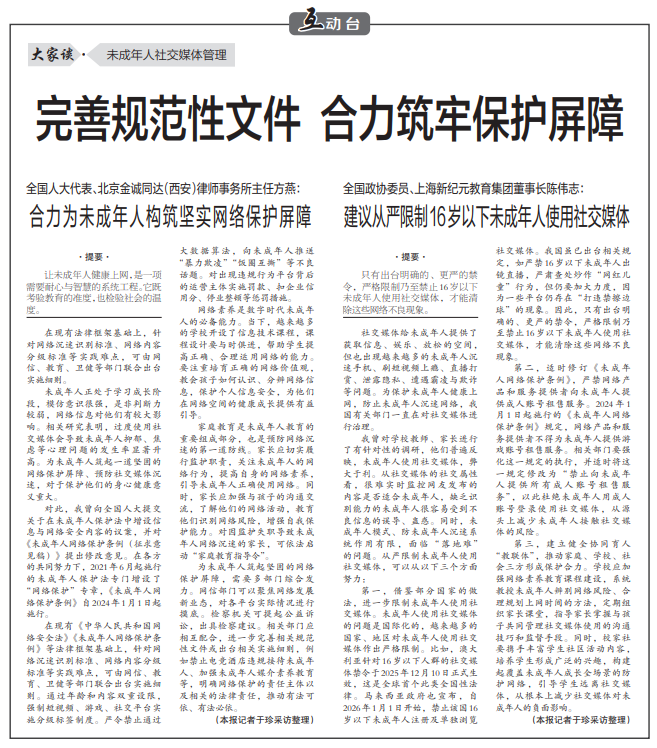 第三,建立健全协同育人“教联体”,推动家庭、学校、社会三方形成保护合力。学校应加强网络素养教育课程建设,系统教授未成年人辨别网络风险、合理规划上网时间的方法,定期组织家长课堂,指导家长掌握与孩子共同管理社交媒体使用的沟通技巧和监督手段。同时,校家社要携手丰富学生社区活动内容,培养学生形成广泛的兴趣,构建起覆盖未成年人成长全场景的防护网络,引导学生远离社交媒体,从根本上减少社交媒体对未成年人的负面影响。(中国教育记者 于珍 采访整理)