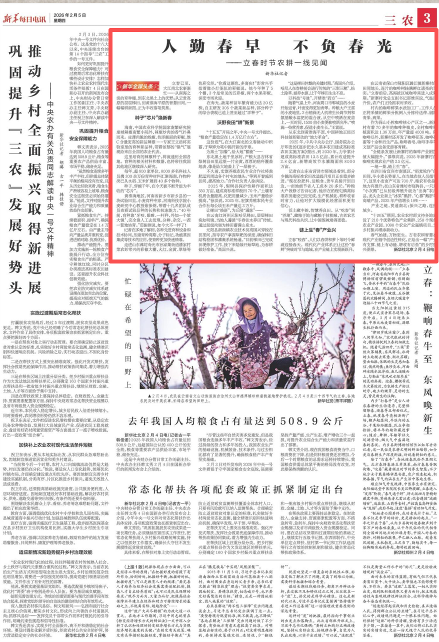 刊发《人勤春早 不负春光——立春时节农耕一线见闻》,报道了黄淮海地区,河南省新乡市新乡县的一块试验田里,小麦育种专家、河南科技学院小麦研究中心教授茹振钢,带着十几名团队成员查看试验品种的长势和抗冻能力。随着气温上升,河南周口市郸城县的小麦开始返青,叶面变得更加青翠。种粮大户王雷的小麦地里,2台植保无人机将生长调节剂和氨基酸水溶肥的混合液,从空中喷洒在麦苗上,一天时间,1500亩小麦便被喷洒完毕。查看完整报道>>>