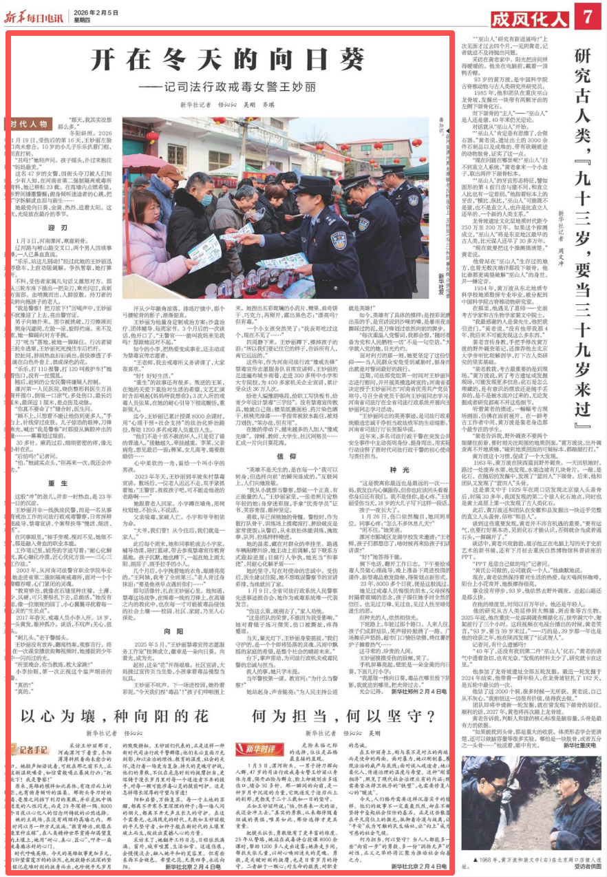 今日出版的《新华每日电讯》刊发《开在冬天的向日葵 —— 记司法行政戒毒女警王妙丽》《以心为壤,种向阳的花》《何为担当,何以坚守?》,报道了1月3日,漯河街头。一男子持刀挥向人群,47岁的司法行政戒毒女警王妙丽以身体为盾,隔开凶险与群众,脸上却被划出多道伤口,缝合30多针。那一瞬间的向前,是一种岁月中沉淀的力量,它既迸发于迎刃而上的刹那,更勃发于二十三载如一日的坚守。查看完整报道>>>