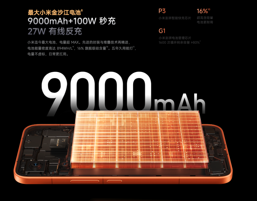 续航也顶到 “ 小米史上最大 ” 9000mAh 电池,搭配 100W 有线闪充、27W 有线反充;
