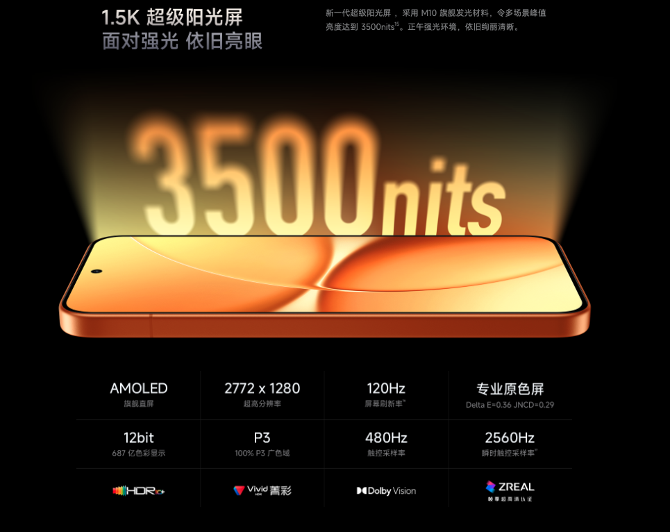 6.83 英寸 1.5K 120Hz 直屏,支持 3500nits 超高亮度、3840Hz PWM + DC 护眼调光;