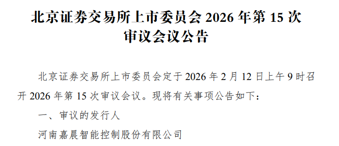 据大河财立方消息,2月5日晚间,北交所上市委员会公告,定于2026年2月12日上午9时召开2026年第15次审议会议,审议河南嘉晨智能控制股份有限公司(简称“嘉晨智能”)上市事项。