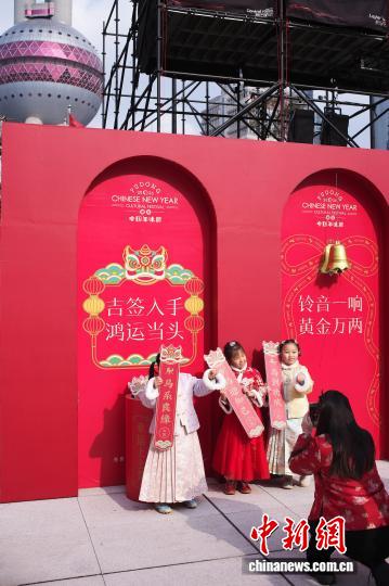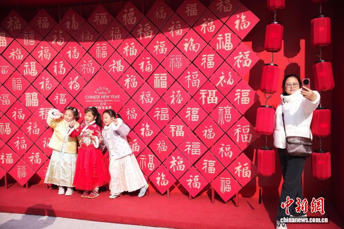 2月7日,孩子们在市集的新年主题装饰背景墙前合影。中新社记者 殷立勤 摄