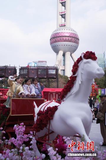 2月7日,游客在市集的马年主题装饰背景墙前合影。中新社记者 殷立勤 摄