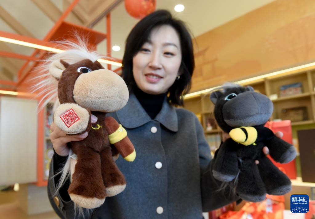 2月7日,工作人员在圆明园文创展示中心介绍新推出的文创产品马首毛绒公仔。