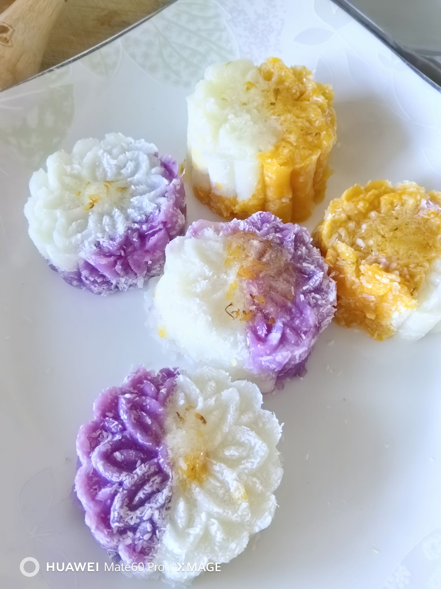 - 做法:紫薯+山药蒸熟压泥,加牛奶炼乳,摆盘。