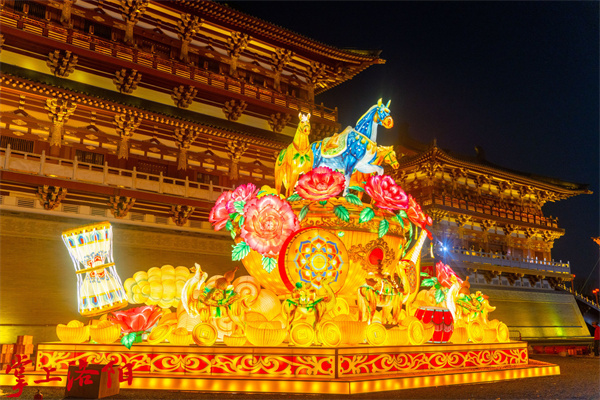 步入九洲池南门,“金狮送福”灯组昂首挺立,金光熠熠,瞬间将游人带入喜庆祥和的新春氛围。沿步道前行,琉璃亭下,复刻唐代琵琶纹饰的“宝相花纹”灯组精巧雅致,尽显唐代工匠巧思;循皇家园林规制打造的“一池三山”意象灯组,与亭台楼阁、碧水回廊浑然一体,再现皇家园林的恢弘气度。