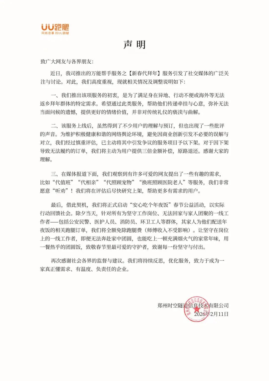 2月11日,“UU跑腿”发布关于代拜年服务的情况说明: