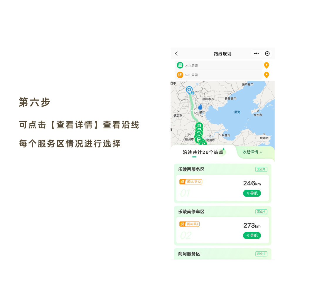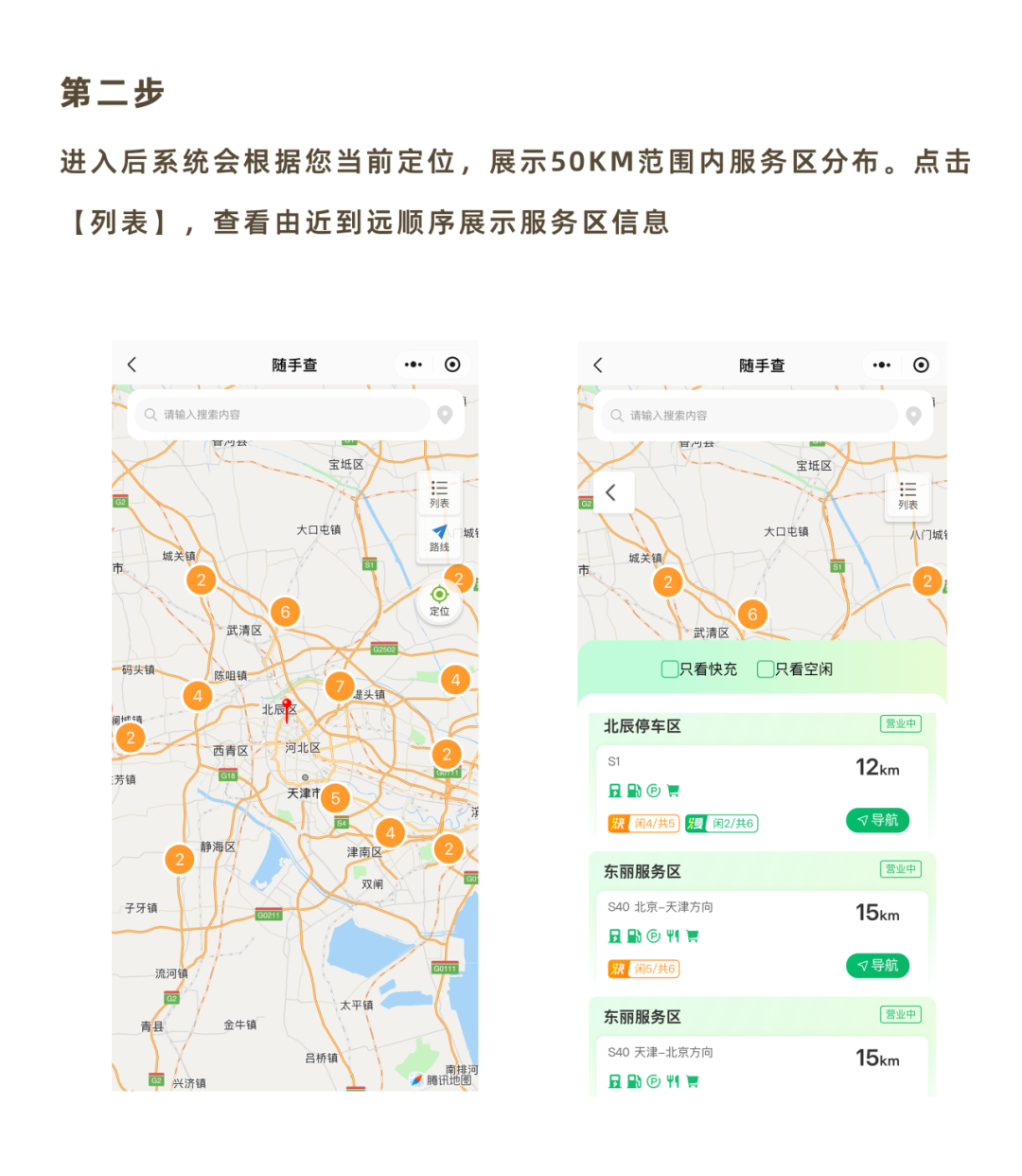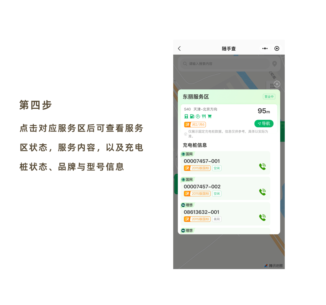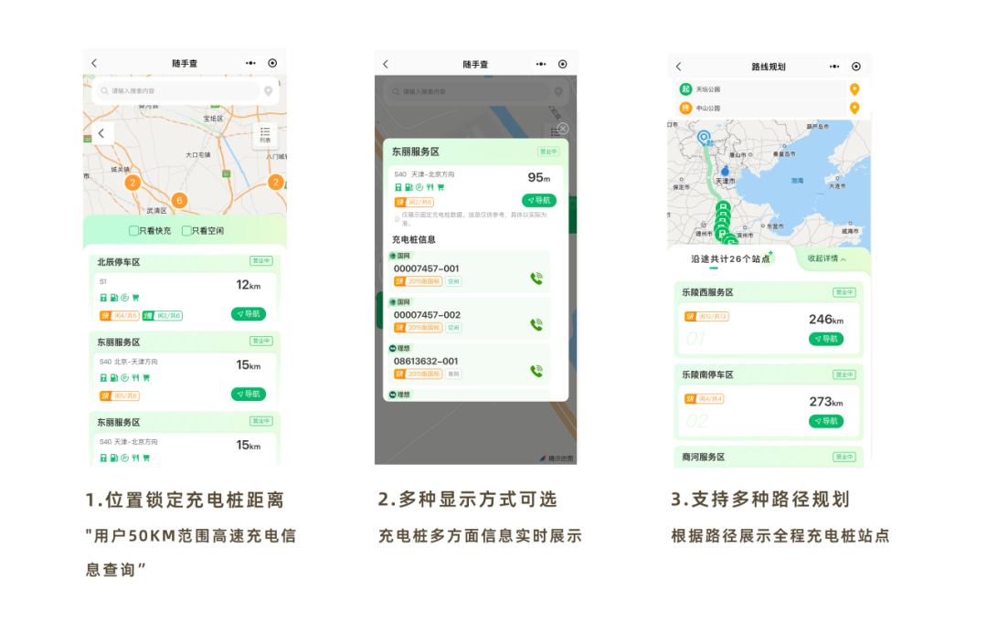 (一)充电桩随手查,缓解新能源车主里程焦虑。整合全国高速公路服务区充电桩动静态信息,为用户提供充电桩位置、品牌、实时状态、充电模式等查询服务,支持筛选“空闲”“快充”设施及一键导航功能,全量接入充电设施数据,确保信息及时准确,有效缓解新能源车主高速出行补能焦虑。