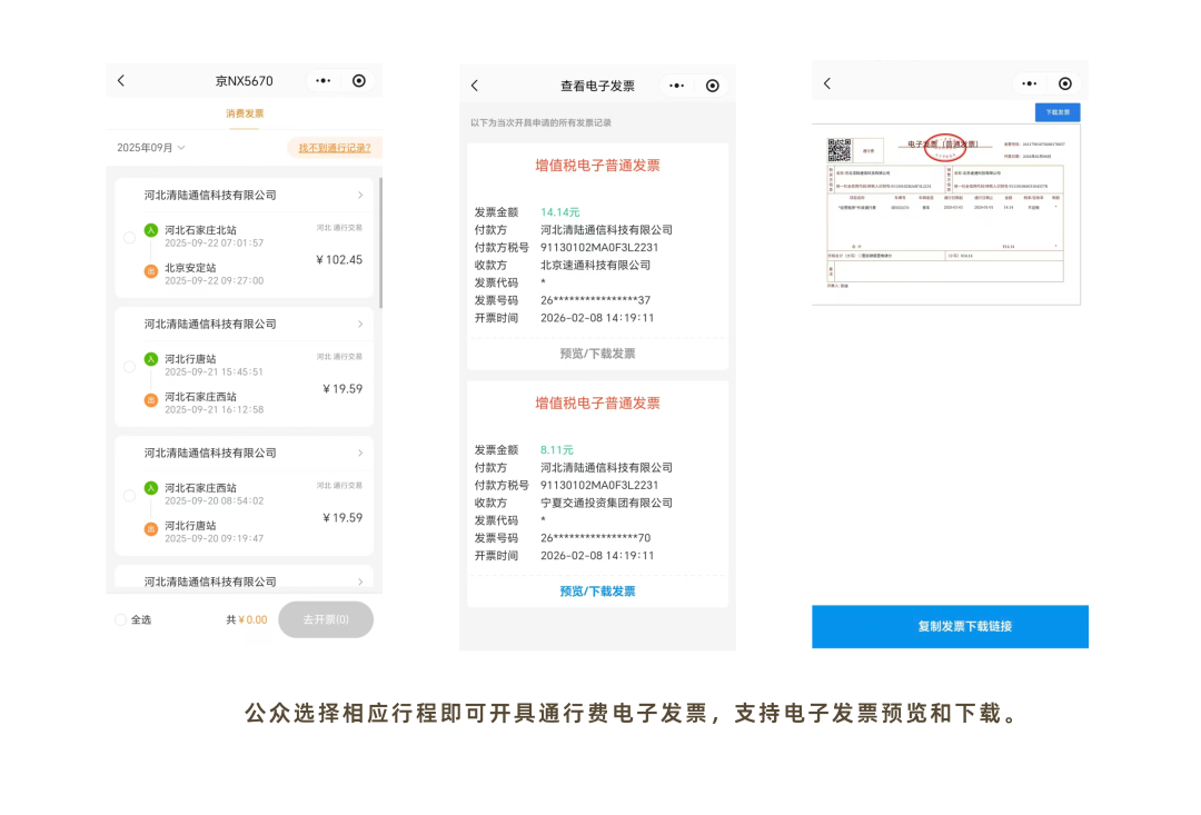 (四)通行费发票服务,助力行业降本提质增效。可实现收费公路通行费电子发票开具,ETC用户登录小程序绑定ETC卡、关联发票抬头后,可直接对通行记录申请开票;使用移动支付的用户输入支付订单号可完成电子发票申请,快速提升开票便捷度。