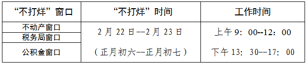 (一)窗口服务(窗口端)。2月22日--2月23日,市自然资源和确权登记交易服务中心、市住房公积金管理中心、市税务局3个进驻窗口部门为企业提供“不动产(转移、抵押、变更)登记、不动产契税缴纳、公积金贷款”等业务现场办理服务。