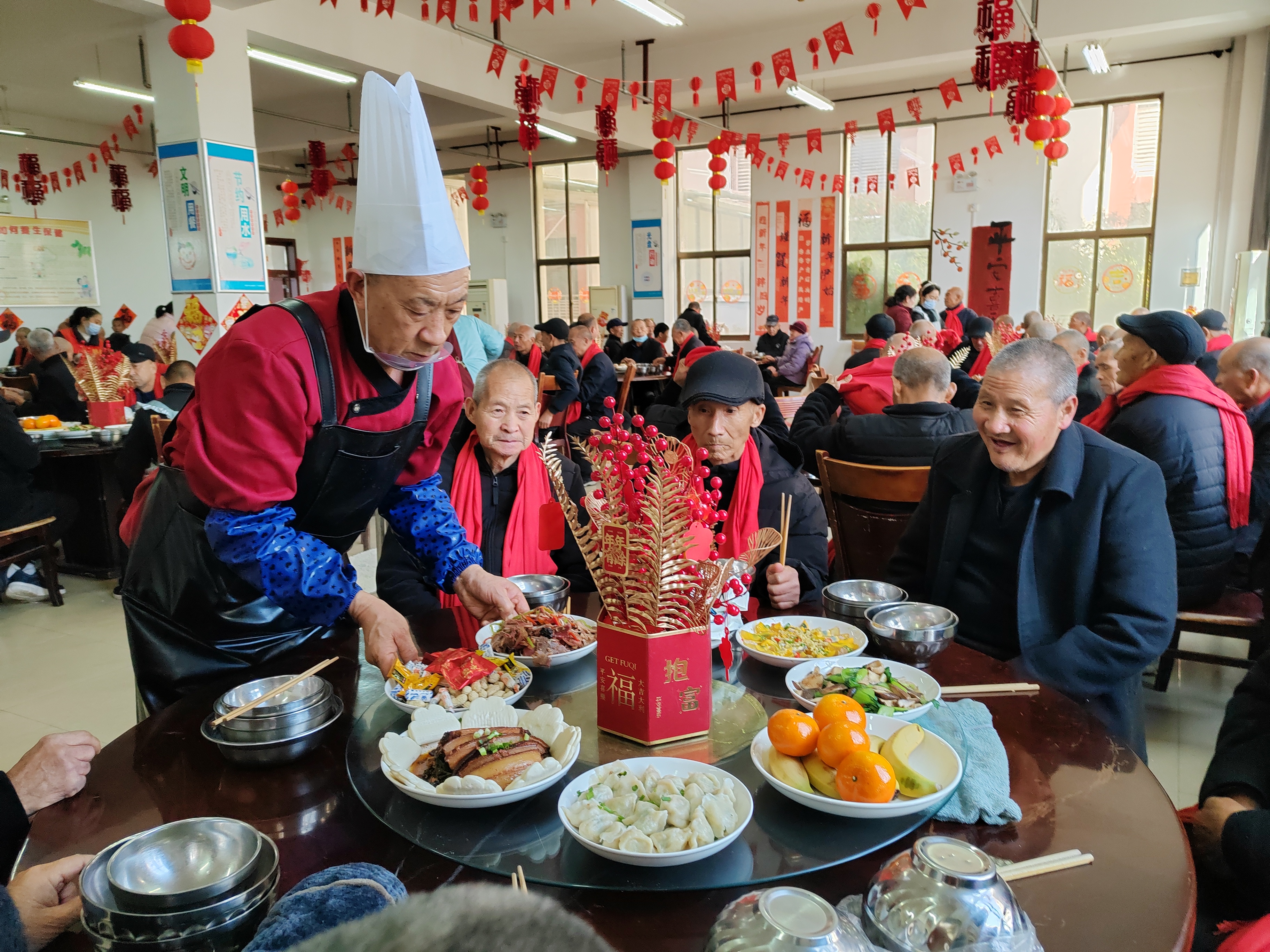 2月10日,农历小年,济源示范区沁园南路与古轵交叉口的社会福利中心灯笼高挂,十几名老人在护理员的指挥下排练新年晚会的节目,韩敖背老人正是其中一位。