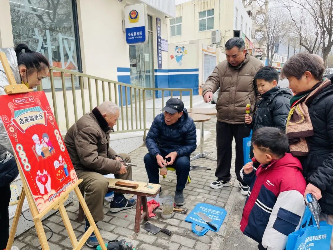 市集设置新春年货区、民俗体验区、志愿服务区等四个专区,各区域人气爆棚、亮点纷呈,不同年龄段的居民各得其乐。新春年货区,散发着舌尖上的诱惑,砂糖橘与草莓金红相映、米面粮油最受大家欢迎......居民认真挑选、满载而归,浓浓年味扑面而来。民俗体验区里,翰墨飘香迎新春,写福字、写对联摊位前居民络绎不绝;孩子们手工制作中国结、拓印福字,让传统民俗在指尖传承焕新;糖葫芦摊位更是备受青睐,酸甜的山楂裹上晶莹的糖衣,一口咬下,儿时的年味记忆瞬间被唤醒,现场满是甜蜜与欢乐。趣味游戏区中,投壶、套圈互动欢乐不停歇。志愿服务区前长龙涌动,“三兄弟”志愿服务队的师傅们手脚麻利,刀具打磨声不绝于耳;博爱眼科医院的医生们为大家做视力检测,新里程医院的医护团队为居民们量血压、测血糖,讲解慢病防护知识,把专业健康服务送到居民家门口。
