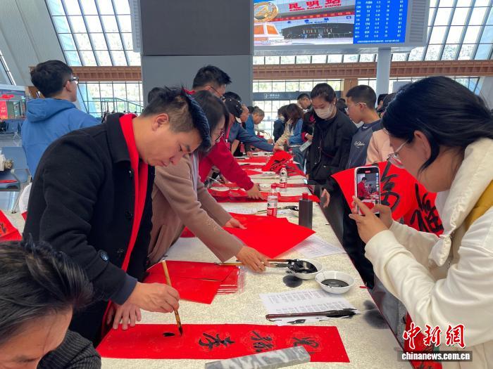 在特色云品区,茶香、咖香、花香、果香四溢,让旅客离开云南的脚步再慢一点,对云南的留念更深一些。在非物质文化遗产代表性项目体验区,传承人展示甲马版画、捏面人、剪纸等技艺,并现场邀请旅客参与体验。在文创展示区,集合了生、旦、净、丑扮相的滇剧妆造演员,让旅客能够尽情快闪打卡、互动拍照;10位书法家现场挥毫泼墨,为旅客写楹联、送福字,让年味儿更浓。“福字到手,回家不愁。”旅客们为活动点赞。
