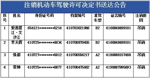 为确保驾驶人自身安全及公共交通安全,根据《机动车驾驶证申领和使用规定》第七十九条有关规定,决定注销下列机动车驾驶人的机动车驾驶许可。现公告送达《注销机动车驾驶许可决定书》,限被注销机动车驾驶许可人自公告之日起60日内,到新乡市公安局交通管理支队车辆管理所(地址:河南省新乡市榆东工业区经十三路)领取《注销机动车驾驶许可决定书》(正本),逾期视为送达。如不服本决定,可以在《注销机动车驾驶许可决定书》送达之日起60日内向新乡市人民政府申请行政复议,或者在6个月内依法向新乡市红旗区人民法院提起行政诉讼。