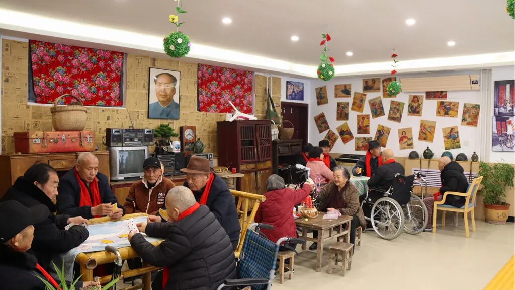 敬老院大厅内,工作人员为老人们送上红围巾、拍新年合照,并陪着爱好书法的老人练习书法;老年活动中心内,“欢乐套圈圈”游戏趣味盎然,跟着动感音乐的节奏,“老朋友”们眼神专注、跃跃欲试,锻炼了手眼协调能力,体验到了成就与快乐;记忆怀旧区内,老人们在具有年代感的场景内进行手工艺制作、打扑克牌等活动,唤醒熟悉的记忆,丰富精神文化生活。