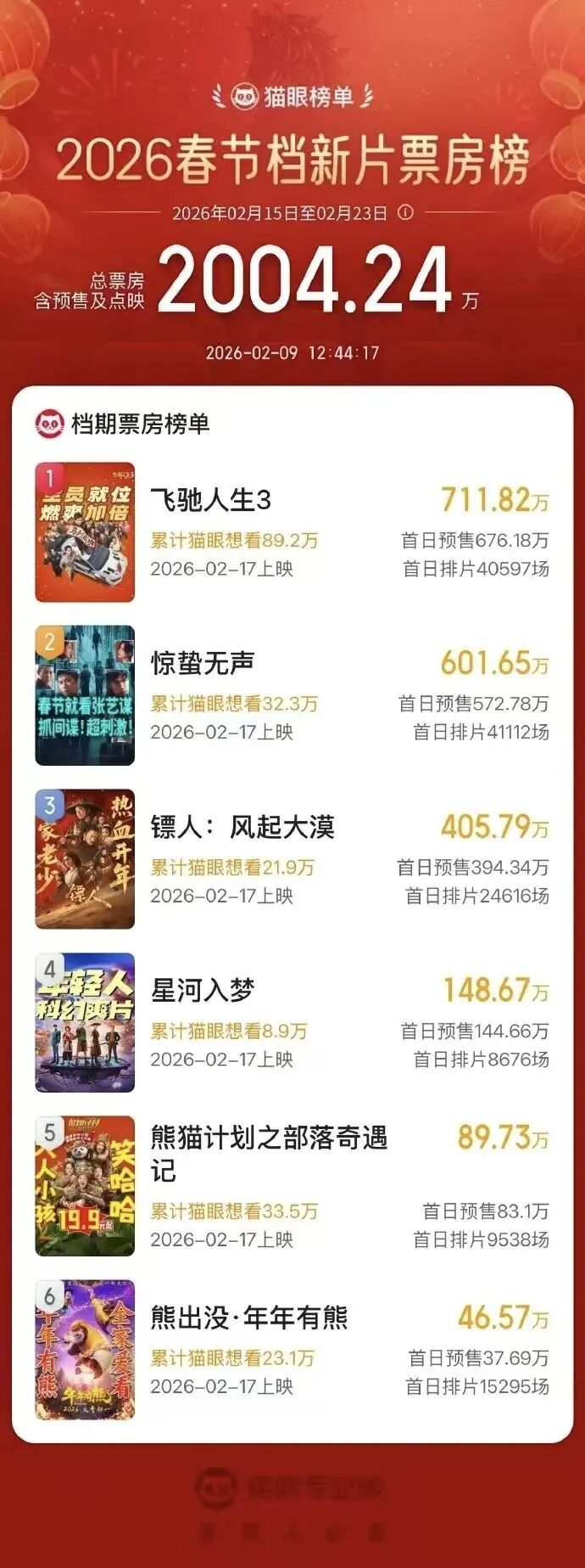 2026春节档新片预售票房破2000万。据猫眼专业版数据,2026年春节档新片预售总票房破2000万,《飞驰人生3》《惊蛰无声》《镖人:风起大漠》分列2026年春节档新片预售票房榜前三。