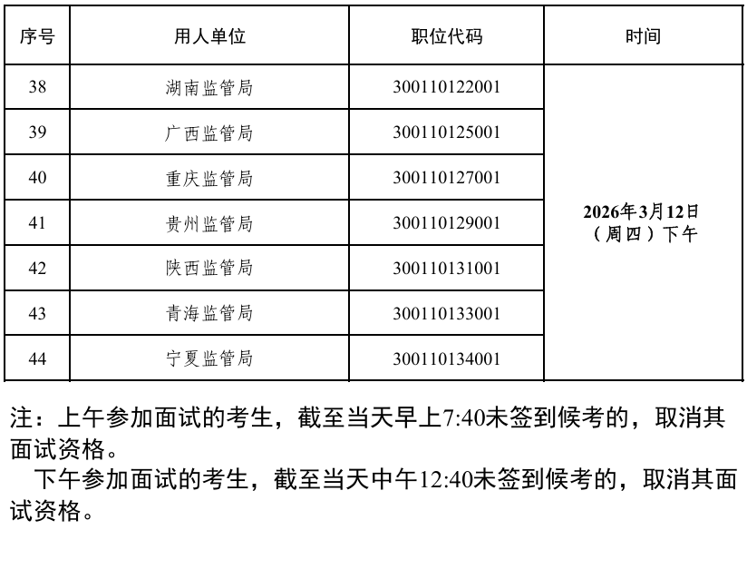 面试将于3月10日至12日进行,请上午面试的考生于当天上午7:40前、下午面试的考生于当天中午12:40前签到候考。对未按上述规定时间签到候考的考生,取消面试资格。