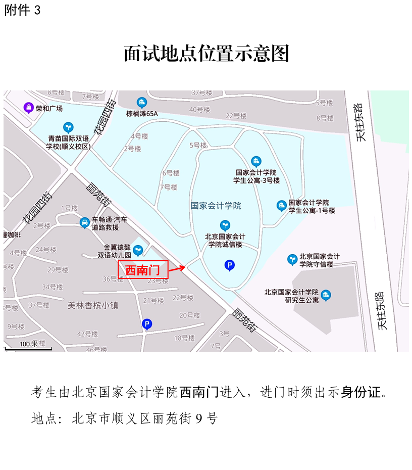 考生统一由北京国家会计学院西南门凭身份证入场。